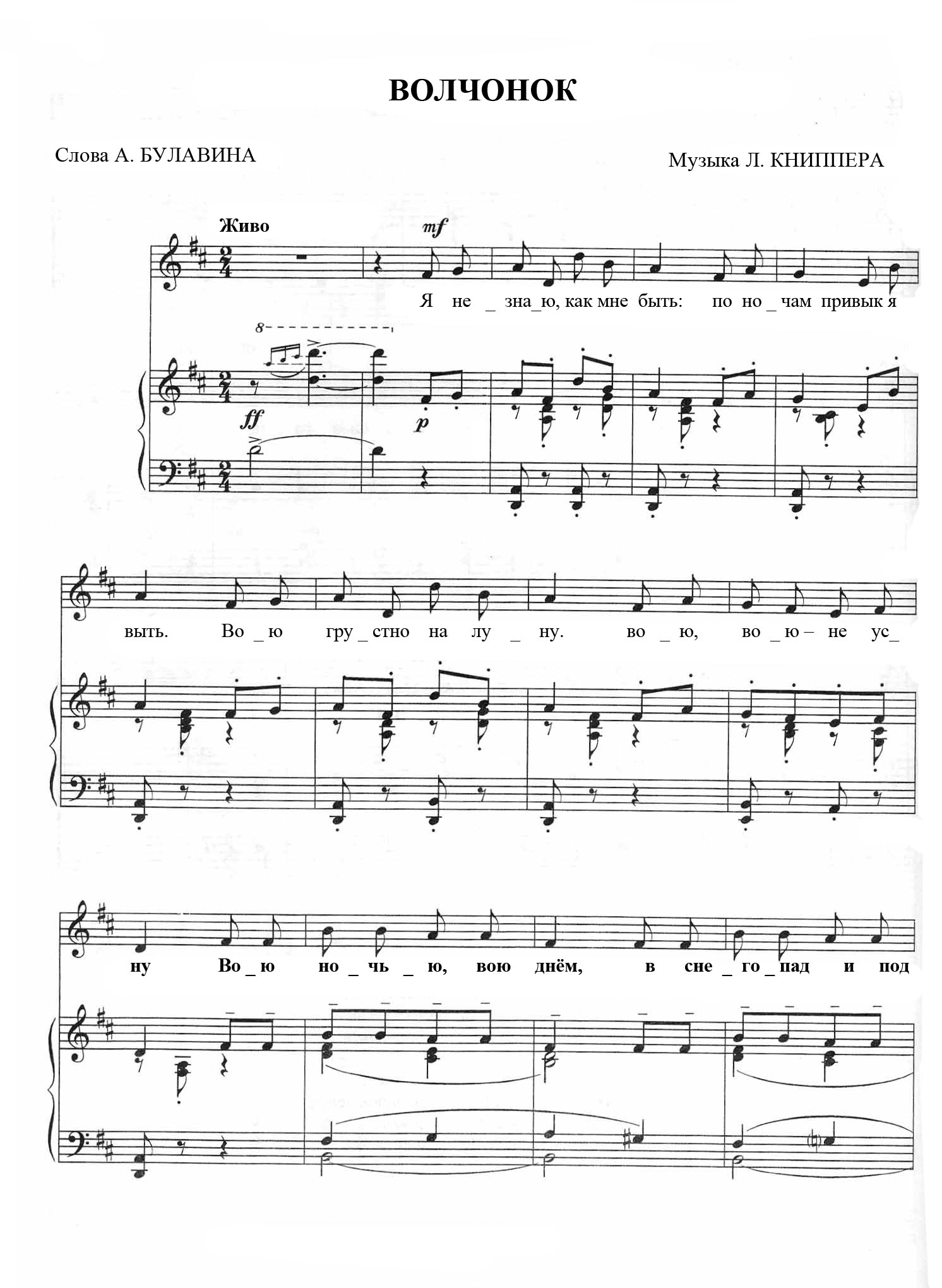 Скачать ноты для пианино хорошего качества и бесплатно "«Волчонок», слова Аркадия Булавина, музыка Льва Книппера". Размер: 230.8 Kb Формат: jpg